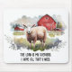 Cute watercolor sheep in a farm field with a red barn and religious verse.