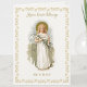 This is a beautiful traditional Catholic vintage image of the Blessed Virgin Mary holding a lily in her arms. All text and fonts can me modified.