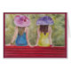 Two Gorgeous classy girlfriends sitting on a red park bench reminiscing their childhood - one wearing a hot pink sun hat with a red rose and beautiful blue dress while the other is wearing a purple hat and a yellow dress. Beautiful Watercolor Greeting Card like no other – one that you can Frame as a keepsake. Congratulate your friends or family on birthdays, weddings, graduations, girlfriends, retirement, coming of age, etc ... An expression of your thoughtfulness and caring. Embrace friendship and encouragement.