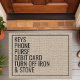 This funny doormat design features the words "Keys, Phone, Purse, Debit Card, Turn Off Iron & Stove". Personalize this cute rustic faux burlap country door mat with your own custom leaving the house reminders. The perfect unique modern housewarming or new homeowners gift.