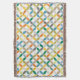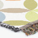 A repeat circular quarters cut out style patterned throw in warm tonal colors of yellow, orange, browns, olive green, grey and blue on a white background by Sarah Trett. Would look great in a bedroom, lounge room.
