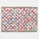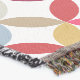 A repeat circular quarters cut out style patterned throw in warm tonal colors of red, browns, grey and blue on a white background by Sarah Trett. Would look great in a bedroom, lounge room.