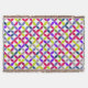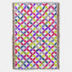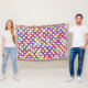 A repeat circular quarters cut out style patterned throw in bright purple, lime green, grey and blue, by Sarah Trett. Would look great in a bedroom, lounge room.