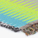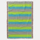 A repeat three color bright dogtooth stripe patterned throw in lime green, blue and grey by Sarah Trett. Would look great in a bedroom, lounge room.