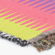 A repeat three color bright dogtooth stripe patterned throw in lime green, purple and pink, by Sarah Trett. Would look great in a bedroom, lounge room.