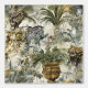 The image is a repeat pattern design for wallpaper featuring a lush, tropical theme. The pattern includes various elements such as a woman dressed in a floral dress with a matching headwrap, a zebra, a cheetah, and a large ornate planter filled with tropical plants. The background is filled with palm trees and other tropical foliage, creating a dense and vibrant jungle atmosphere. The combination of wildlife and botanical elements makes this pattern visually rich and engaging, suitable for creating an exotic and lively ambiance in interior spaces.