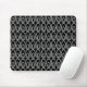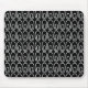 This mouse pad has a mid-century modern design of a small oval inside a bigger oval on a field of black.