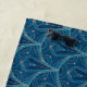 Repeating geometric Art Deco pattern with teal lines and orange dots on a dark blue background, creating a symmetrical and elegant design.