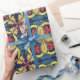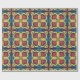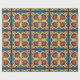 A repeating geometric pattern with red and yellow floral shapes on a blue and dark background. The design is vibrant and symmetrical, creating a lively, energetic feel.
