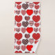 This towel set has a Valentine’s design of repeating hearts with different graphics inside on a field of white.