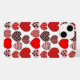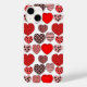 This phone case has a Valentine’s design of repeating hearts with different graphics inside on a field of white.