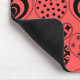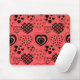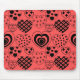 This mouse pad has a Valentine’s design of repeating hearts with different graphics inside on a field of white.