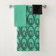 This towel set has a black washcloth, a mint green hand towel, and a bath towel with a mid-century modern design of a small oval inside a bigger oval on a field of mint green.
