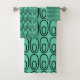This towel set has a mid-century modern design of a small oval inside a bigger oval on a field of mint green.