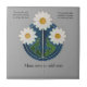 A trio of yellow centered white daisies with green leaves offset against a rich blue on a soft grey background make this a simple yet sophisticated choice. Available in 4.5 and 6 inch tiles to personalize (or not). Can be used as a wall or backsplash tile, framed as art, or made into keepsake boxes and other useful and decorative accessories. Personalize as you wish for wedding and anniversary gifts, wedding favors, attendants' gifts, and more. Please see our Media Pages for inspiration and some examples of customized tiles. Note that although the tile this is reproduced from is molded and dimensional, this one is actually printed in a faux relief or trompe l'oeil style that captures the dimensional look of the antique original on a smooth, flat surface.