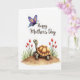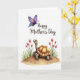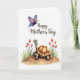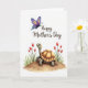 This greeting card features a cute, human-like reptile with smooth light olive-green skin and a segmented golden-brown shell, standing on a gently rounded earthen mound as if waiting for a hug ❤️. Its wide eyes and small upturned smile create a tender, friendly look that feels like quiet affection in picture form. On both sides, slender-stemmed red flowers similar to tulips rise from green leaves, framing the little character like a garden moment shared with someone special 🌼. A detailed butterfly floats above, its wings patterned with deep purples, bright blues, and sunny yellows with tiny spots and stripes that add sparkle without feeling busy. The background stays plain white, letting the soft, watercolor-like shading and gentle color transitions stand out. Across the top, the words “Happy Mother’s Day” sit centered in a warm sepia tone, placed high to leave the illustration open and airy below. Fine linework shows careful texture on the shell segments and subtle highlights on the butterfly wings. The red blossoms lean inward on either side of the mound, with green foliage clustered at their bases.