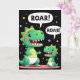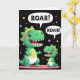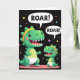 This design shows two stylized reptile characters in glowing emerald green, with one noticeably larger as they stand close together on a deep black background, their bodies angled as if sharing a private joke ❤️. Their rounded shapes, small spikes, and big shiny eyes are paired with rosy cheeks that make their grins feel affectionate rather than fierce. Both have wide-open mouths showing neat white teeth and bright red tongues, like they’re calling out in sync to amuse each other. Each wears a yellow-orange headband and a simple white garment at the waist, adding a cute, costume-like touch that hints at friendship and togetherness. Above their heads, two white speech bubbles contain the word “ROAR!” in dark lettering, placed near the top so it reads like a shared chorus. Scattered around them are soft, circular dots in pastel yellow, pink, blue, and purple, like confetti drifting through space 🌼. A curved reddish-pink strip sits along the bottom edge, grounding the pair against the dark backdrop.