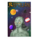 Extra terrestrial art with a reptilian alien with a background of stars and planets.