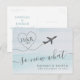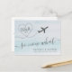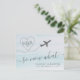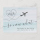 Beach Destination Wedding Postponement Announcement Postcard lets your guests know in a funny and humorous way that your wedding location or date (or both) has to be rescheduled or changed due to travel restrictions, while you are still figuring out how to change wedding plans. The beautiful aqua turquoise blue background texture works for many travel theme and beach color themes, and our unique airplane monogram logo has initials inside with fun and modern calligraphy script fonts and a combination of interesting typography. Visit the Paper Grape Destinations Zazzle Designer Shop for more travel and beach theme wedding invitation, save the dates, and postponement announcements.