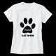 This pretty tshirt is the perfect gift for the rescue cat Mom. The black and white tshirt features black sleeves and a white body where a black cat paw print appears with the word "Rescue" inside. The words "CAT MOM" appear right below. This is a great tshirt for encouraging people to adopt don't shop! Order a size up, as this shirt style runs small. Copyright peachesthetuxedocate