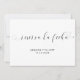 A typography Spanish Save the Date featuring the words, "Reserva la Fecha" in black calligraphy with swashes and hearts over a white background. The backside is black and may be changed to any color you wish. The simple and minimal layout and lots of open space give this design a modern feel and the calligraphy lettering and hearts give it a romantic twist.