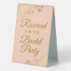 This simple tabletop sign will let your wedding guests know which areas are reserved for the bridal party. The simple pale coral or peach colored design features elegant gold script lettering with decorative golden faux foil curls and swirls in the corners.