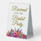 This simple tabletop sign will let your wedding guests know which areas are reserved for the bridal party. The vibrant colorful design features elegant gold script lettering and a cluster of tropical hibiscus flowers in shades of hot pink, magenta, and purple, along with yellow bird of paradise, jade green monstera leaves and garden greenery.