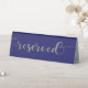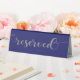 Navy blue reserved table tent sign with elegant faux silver calligraphy. Simple, customizable.