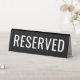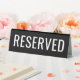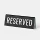 Black tabletop tent sign with white, customizable text "reserved" in big, bold letters.