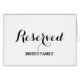 Reserved table or seating sign card for place. Elegant script calligraphy typography for fancy wedding party, chic bridal shower, engagement or anniversary. Classy placement note cards with name of bride and groom family, VIP guests, bridesmaids, groomsmen, best man, maid of honor etc.