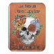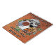 The artwork is of a skull adorned with flowers and a butterfly on an orange grunge background.