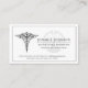 A minimal Respiratory Therapist business card featuring a medical caduceus symbol on a simple black, and white one-sided card. In the backdrop is a faded set of lungs symbol to signify the specific field of medicine.