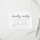 Keep your wedding details simple and elegant with this Response Wedding Insert Card. Designed in a clean and minimalist style, this RSVP card makes it easy for guests to confirm their attendance and share meal preferences. Perfect for modern weddings, this timeless insert card adds a touch of sophistication while keeping your stationery suite coordinated and stylish.
