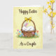 Designed with a soft, springtime scene, this illustration centers on a long-eared white bunny 🐰 curled up asleep inside a rustic woven basket. Gentle pink touches warm the inner ears and tiny nose, and the bunny’s closed eyes and tucked paws suggest a tender, safe little moment. A sunny yellow ribbon is tied in a neat bow on the basket handle, drawing the eye with a bright accent against the earthy brown weave. Around the basket, fresh green grass is sprinkled with small flowers in light pink, sky blue, and soft orange, like a garden arranged for someone special 🌷. The background is a mellow, sunlit yellow with a lightly brushed texture that feels like late-morning light. Short greeting text sits at the top and bottom in a flowing, decorative style, set in a darker tone that stands out clearly on the warm backdrop. The basket’s woven strands are carefully shaded, and the bow’s loops and tails curve crisply over the handle.