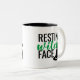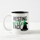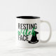 Resting Witch Face! Enjoy your favorite hot beverage with this funny Halloween phrase (or any other day for that matter) two-toned coffee mug. This design features a black sans serif font, along with a witch green script, next to a witch hat. Happy Halloween!