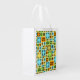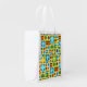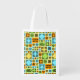 A reusable grocery bag with a busy pattern and funny caption. Use "Personalize this template" to change the "Attention Shoppers Retail Therapy In Progress" text if desired. A bold and colorful design featuring decorative tiles of various sizes and varied patterns. Black designs on faded orange, green, blue and yellow backgrounds. All patterns were designed and drawn by me and are inspired by Celtic and Islamic design.