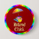 Retired Chick, white text on dark background, button/pin with multicolored frame