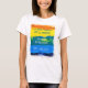 This tee has an artistic, colorful painted background with bands of vivid colors: orange, yellow, green, sky blue, and ocean blue.