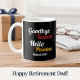 "Goodbye Tension, Hello Pension, Retired Year" Coffee Mug with Retro-Style Colorful Red and Yellow Script Typography. Black and White Modern Design.