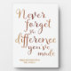 Never forget the difference you've made! A beautiful dark gold sign perfect for your retirement party or as a retirement gift to someone who has given great service. Personalize with your own message or delete to focus on the quote.