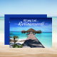 Retirement Celebration Party Card designed with a tropical setting with the text: At Long Last... Retirement! Invite family, friends and co-workers to celebrate a special retiree with this fun Retirement Celebration Party Invitation. The reverse side text includes: the name, date, time, location, address and RSVP details, on a blue background with white text. To personalize, simply insert your text into our easy template, replacing the sample.