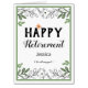 Lovely and elegant fonts say "Happy Retirement!" with small font reading "we will miss you". Inside the card is adjustable text with a statement of congratulations. whimsical vine and floral graphic on front of the card created by Valarie Wade. All text is adjustable. White background with hand drawn leaf and flower artwork.