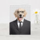 Golden retriever dog in black business suit and black frame eyeglasses on brick wall background for retirement congratulations.