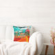 The pillow has an artistic, colorful painted background with vivid colors: orange, red, yellow, teal, along with touches of white.