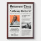 Celebrate the retirement of your teacher with this newspaper wood plaque. Edit the template details with your retiree's highlights. Perfect for college professors, high school teachers, elementary school teachers, school counselors, school principals, superintendents, custodians, bus drivers, township managers and more.