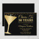 Invite your retirement party guests in style with this elegant gold on black flat card invitation. This design features a faux gold champagne glass on the left with bubbles and confetti with your party details on the right in a modern script typography. The introduction reads "Cheers To 30 Years, join us for a retirement party, In honor of" which may be left as is or personalized. Designed by artist ©Susan Coffey.