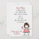 Cute stick girl with red wine in glass, hair and gingham dress on soft white background for a retirement party.