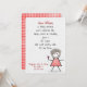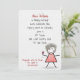 Cute stick girl with red wine in glass, hair and gingham dress on soft white background for a retirement party.