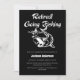 A black and white retirement party invitation featuring an image of an eager fish about to take the bait on a float.