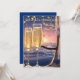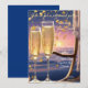 The soft golden glow of champagne flutes filled with bubbly drink is accompanied by falling golden star confetti, creating a festive vibe. A bouquet of blush pink roses adds a touch of warmth and sophistication, while the tranquil ocean sunset in the background suggests a peaceful new beginning. This scene embodies the joy, elegance, and excitement that would accompany such a milestone as retirement.